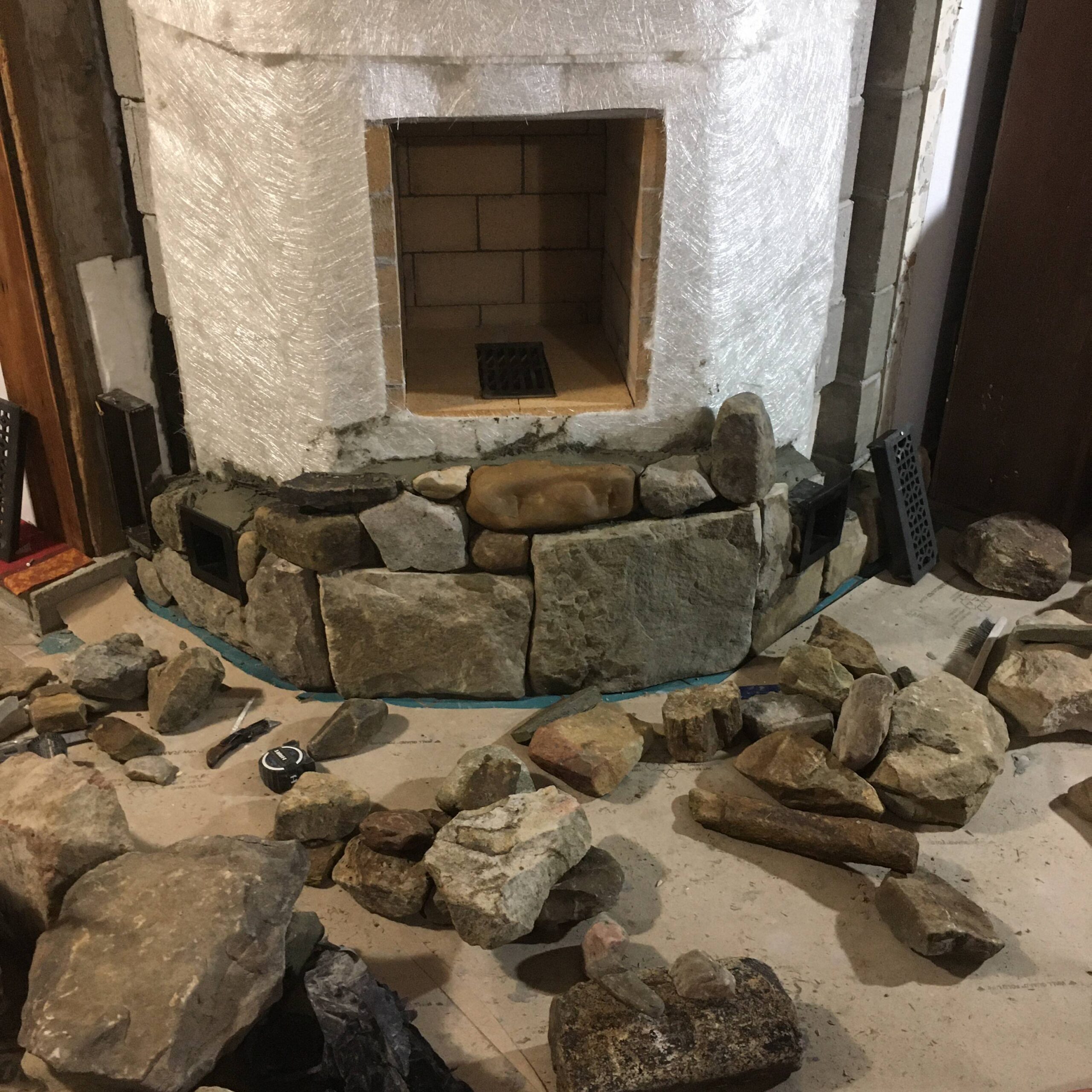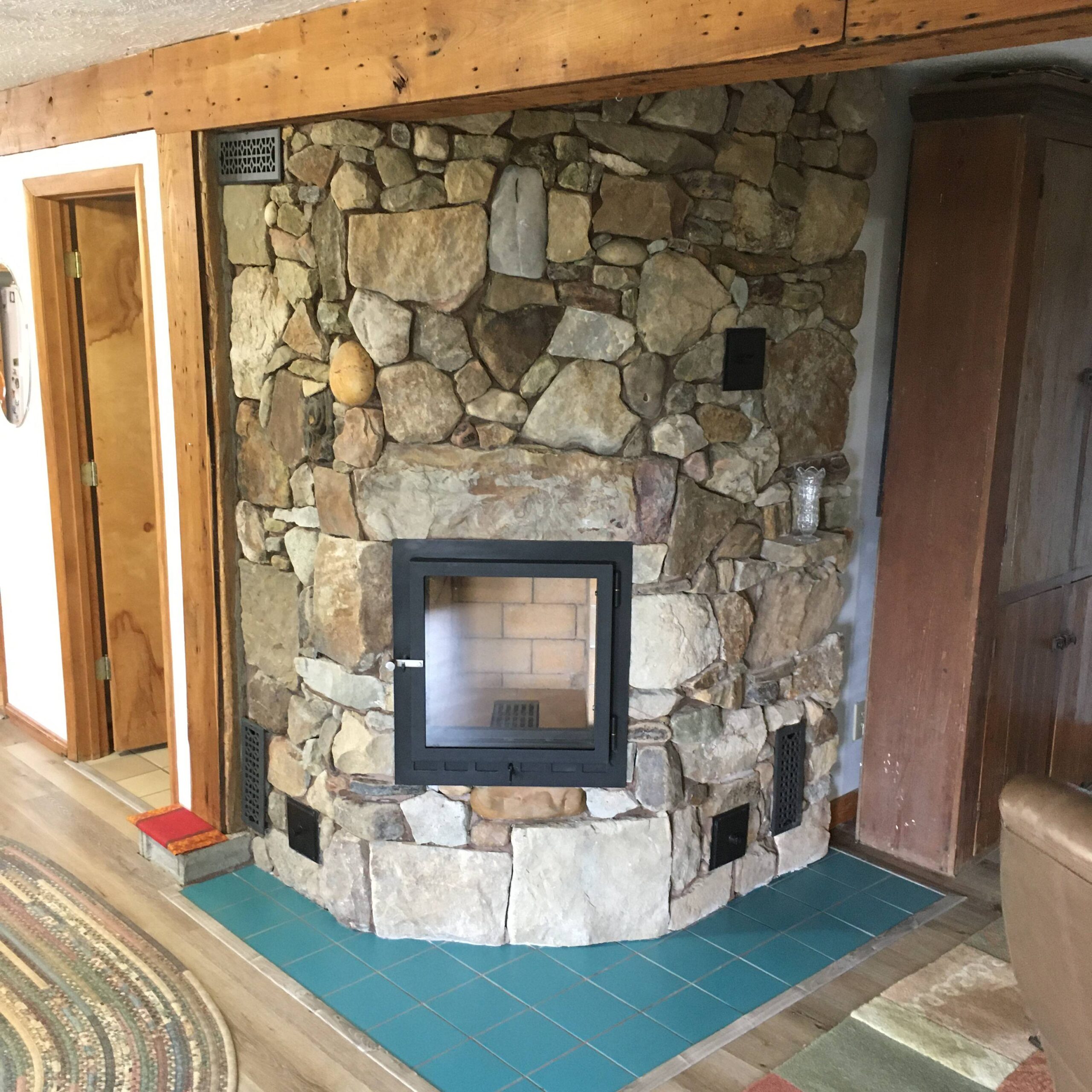 The clients opted to replace a damaged and smoking fireplace with a masonry heater. It is built with a prefab core, insulated flue, passive heat vents, and faced with stone sourced from around the home.